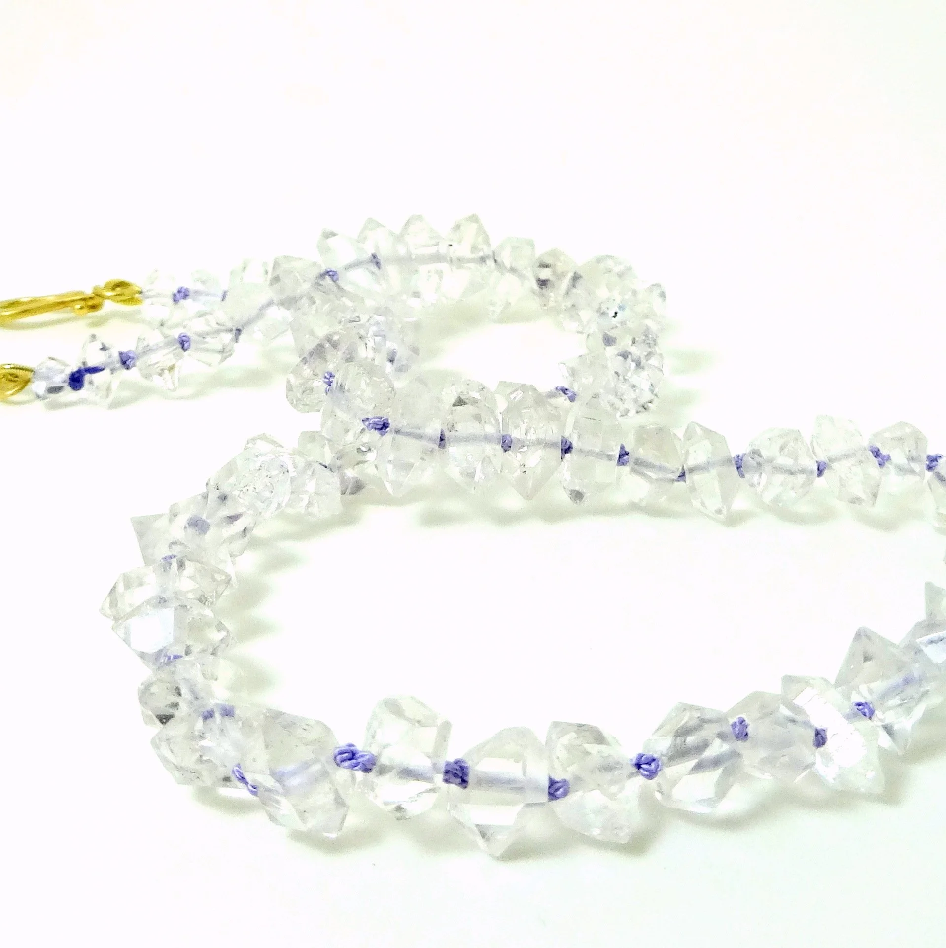 The very first piece of this series made for a bride in 2016, was a row of sparkling Herkimer diamonds, hand knotted on lavender silk, with an 18k gold, hand fabricated hook and eye clasp.
